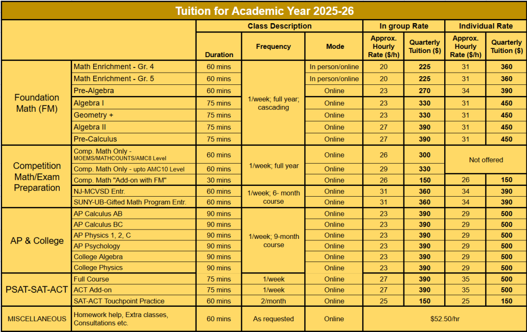 ▶ If a student is taking other courses with us and wants to add another course (say, SAT course), we may provide multi-course discount on the course with lesser tuition, during simultaneous operation. Please request further information, if such cases arise.
